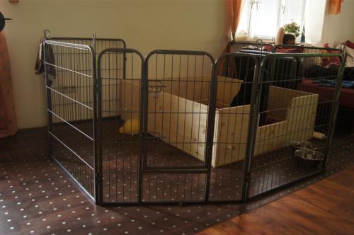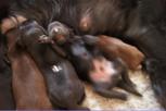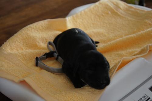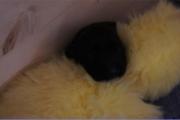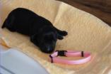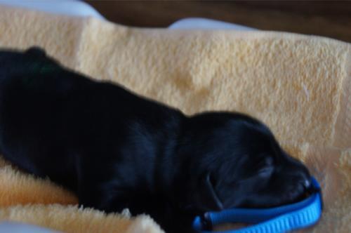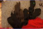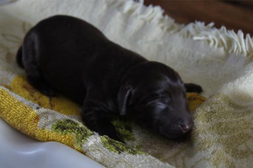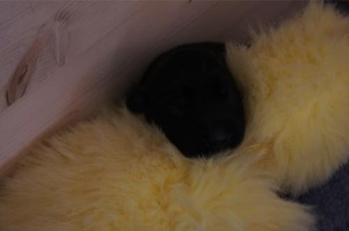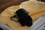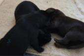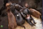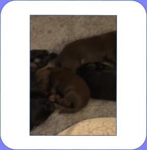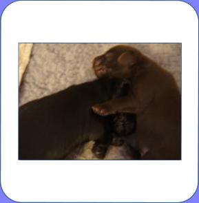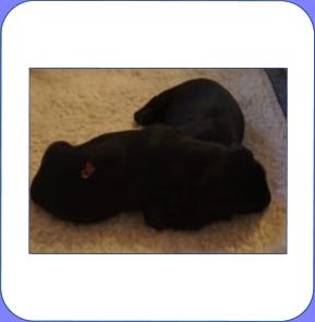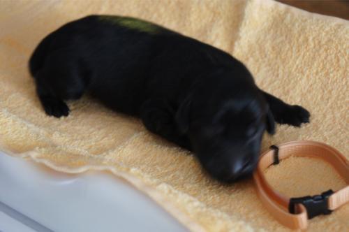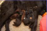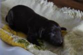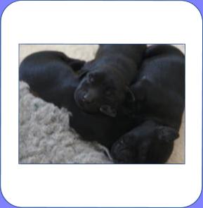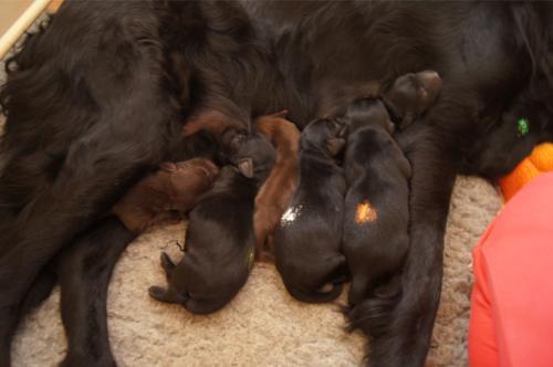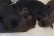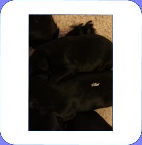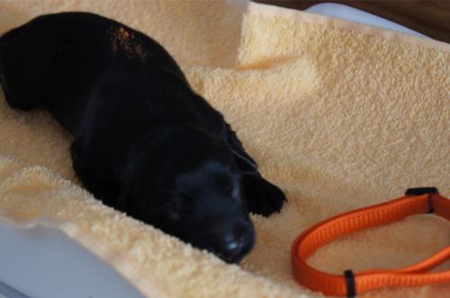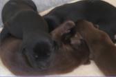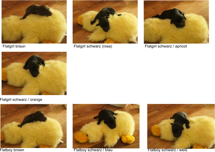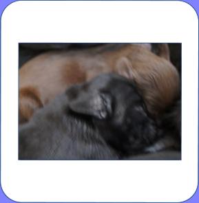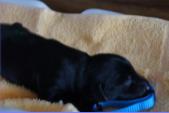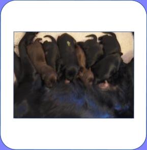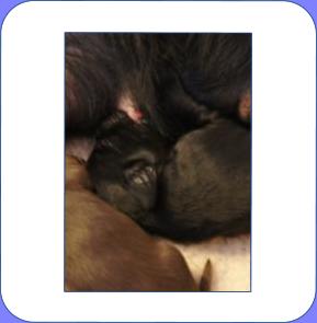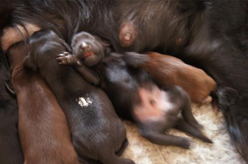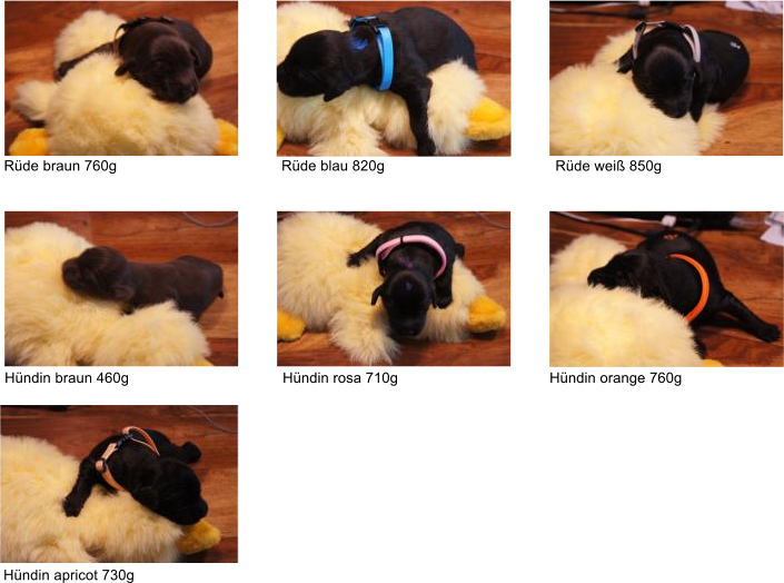 B-Wurf * 6. Juni 2012Bei den Markierungen gab und gibt es noch einige Änderungen, da alle Rüden erst einmal braun aussahen, sich aber nach dem Trocknen doch als schwarz entpuppt haben. Zudem putzt und leckt Lilly ihre Babies so intensiv, dass ständig die Farben fast restlos verschwunden sind. Da muss ich mir wohl etwas anderes einfallen lassen...... Jetzt sind kleine Welpenhalsbänder gekommen und stimmen leider nicht mit unseren Farben überein - bedeutet: wir werden die Farben erneut ändern müssen -versprochen, es wird das letzte Mal sein :)Die Sache mit dem Auseinanderhalten war letztes Jahr definitiv einfacher :)7. Juni 20128. Juni 20129. Juni 201211. Juni 2012 - 5 Tage altDie Kleinen sind schon ganz schön gewachsen und haben schon fast alle die 600g-Marke überschritten. Auch unsere braune Minimaus (Tessas absoluter Liebling) nimmt täglich zu und ist eine richtige Kämpferin; sie ist zwar nur fast halb so schwer wie ihre Geschwister, lässt sich aber nix gefallen und erkämpft und verteidigt erfolgreich ihren Platz an der Milchbar. Lilly ist eine tolle Mama und kümmert sich rührend um ihre Kleinen. Anders als im letzten Jahr, verlässt sie seit dem 2. Tag auch schon mal die Welpenkiste, wenn die Babies schlafen - vielleicht merkt sie tatsächlich, dass die Kleinen sich beim Schlafen gegenseitig wärmen können und nicht so dringend ihre Gesellschaft brauchen wie ihr Einzelkind im letzten Jahr. Damals hat sie 2 Wochen lang die Welpenkiste nur unter Zwang verlassen und wollte sogar dort gefüttert werden und 1 Pieps von Arnie und sie war wieder in der Kiste. Dieses Mal guckt sie erst einmal nach und scheint genau zu unterscheiden, ob ein Baby hungrig ist oder nur die Nähe seiner Geschwister sucht. Wunderbar dies alles zu beobachten.Ich hingegen leide mittlerweile etwas unter Schlafmangel, da ich nachts bei jedem Gequäke aufwache und runter renne, aus Angst, eins der Kleinen könnte vielleicht irgendwo in einer Ecke festhängen oder unter Lilly begraben sein ...... Nachtrag: Die Sache mit dem Schlafmangel wird wohl nicht wirklich besser, denn heute Nacht war ich mit einem der Knirpse in der Klinik, weil er ständig ganz kläglich jammerte - ich tippte auf Bauchschmerzen, aber der kleine Wurm tat mir entsetzlich leid. Also fuhr ich mit Baby und Tessaum 1h in die Klinik, wo dann nach einer Röntgenaufnahme eine Kolik diagnostiziert wurde. Es gab ein Schmerzmittel und eine Aufbauspritze undab ging es wieder nach Hause, Bauchweh war weg und die Maus fing sofort wieder an bei Mama zu trinken :)). Der klägliche Rest der Nacht verlief dann ruhig....1. Woche6. Juni 2012JungsRüde braun(braun)Rüde schwarz(grau)Rüde schwarz(blau)MädelsHündin braun(ohne)Hündin schwarz(rosa)Hündin schwarz(orange)Hündin schwarz(apricot)Nachdem wir nun die Welpenhalsbändchen bekommen haben, sind dies dieentgültigen Farbzuordnungen - ohne wenn und aber :)). Auf Bildern ab dem 12.06. stimmen nun auch die Markierungen auf dem Rücken hiermit überein(alle wurden heute beim Wiegen “umlackiert”).13. Juni 2012 - WIR SIND SCHON 1 WOCHE ALT!!!!12. Juni 2012 - 6 Tage altHeute war unser kleiner Patient nochmals in der Klinik zur Nachuntersuchung und DER Star der Praxis. Wir mussten die kleine Maus hütenwie einen Schatz, denn jeder, wirklich jeder, vom Patientenbesitzer im Wartezimmer bis hin zur Tierärztin wollten sie am liebsten behalten.Bei der Nachuntersuchung wurde nix festgestellt, wir sollen lediglich mal drauf achten, ob alle Geschäftchen gut erledigt werden. Ha, ha, wie soll das denn gehen? Lilly hält die Kleinen so sauber, dass ich nix, aber auch gar nix in der Wurfbox finden kann. Ich massiere also nach dem Trinken das Bäuchlein, aber auch das blieb bisher ohne Erfolg - machen wir halt weiter, irgendwann wird es schon klappen.Bis auf unsere Mini-Maus haben alle ihr Gewicht nun schon verdoppelt und sehen im Moment wie kleine Happy Hipposaus. Wir haben zwar schon seit Tagen eine reichhaltige Geräuschkulisse hier, aber seit heute wird fleißig am Bellen geübt.
