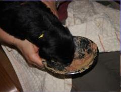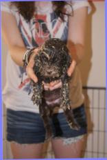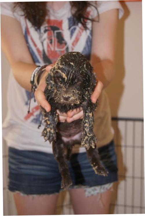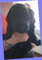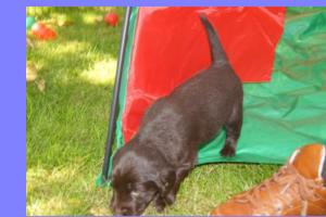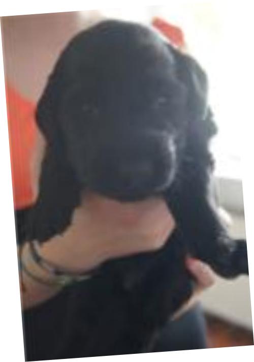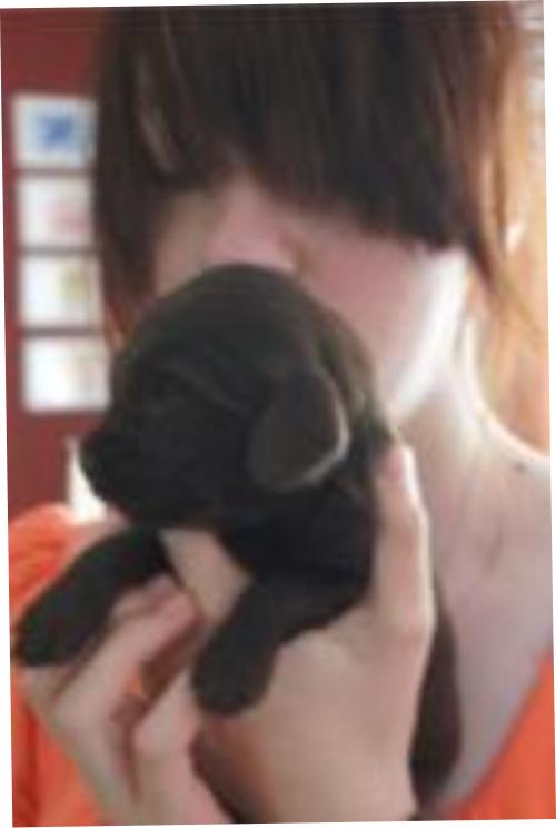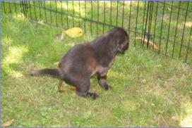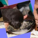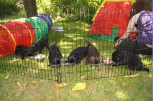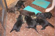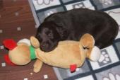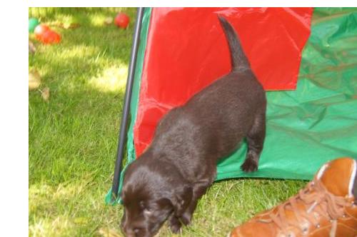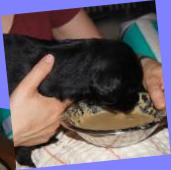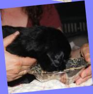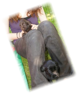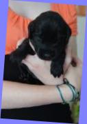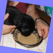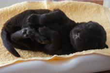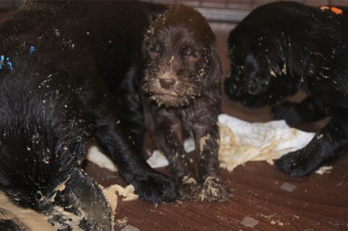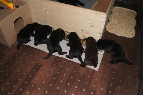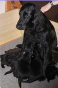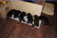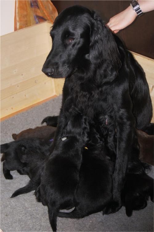 B-Wurf * 6. Juni 20124. Woche27. Juni 2012Kaum zu glauben, es beginnt nun schon die 4. Woche unserer Wonneproppen. Wir haben die Welpenkiste geöffnet und die Kleinen beginnen nun ein neue kleine Welt zu entdecken und herumliegendes Spielzeug zu beknabbern. Es wird gebellt, was das Zeug hält, jeder soll wissen, dass es kleine Flats gibt, die die Welt erobern möchten. Wir haben heute mit dem Zufüttern begonnen, da Lilly es kaum noch schafft, die ständig wachsende und hungrige Rasselbande satt zu kriegen. Leider hatten wir alle Hände voll zu tun, jedem einzelnen zu zeigen, dass es auch Futter außerhalb der Milchbar gibt und wie dieses neue Futter gefressen werden soll, dass es unmöglich war, Bilder davon zu machen - schade. Alle Welpen mussten sich hinterher einen kleinen Waschung unterziehen. Auch die Umgebung machte den Eindruck, als hätten wir mehr Brei herumgeworfen, als an die Welpen verfüttert :))JungsRüde braun (braun) 1540gRüde schwarz (grau) 1780gRüde schwarz (blau) 1730gMädelsHündin braun (ohne) 920gHündin schwarz (rosa) 1620gHündin schwarz (orange) 1650gHündin schwarz (apricot) 1610gHündin gelbHündin lilaHündin orangeRüde grauRüde braun “Jasper”Rüde blau “Balu”Hündin braun “Buffy”28. Juni bis 2. Juli 2012Die kleinen Flatnasen werden immer unternehmungslustiger. Wir haben mit dem Zufüttern begonnen, erst im Einzeltraining, was sehrviel Zeit in Anspruch nimmt. Nach 2 Tagen dachten wir uns, nun könnte es klappen und wir uns eine Menge Zeit sparen - aber wie manauf den Bildern sehen kann, erinnert diese Mahlzeit eher an Schlammcatchen als an eine gesittete Futteraufnahme......Jasper bei der SiestaLilly mit ihren 7 hungrigenMäulernLinus kurz vorm Einschlafenund nun die erste gemeinsame Mahlzeit.......tägliche Schmuse- bzw. Kampf- einheiten mit Tessaalles geht drunter und drüber....Balu immer besonders gründlich,auch der letzte Krümel muss weg...und so sahen alle hinerher aus........also gibt es wieder Einzeltraining :)))....auf ein Neues - und jetzt klappt`s6 der 7 Flatnasen - Buffy bekommt noch Einzeltraining4. Juli 2012Heute waren alle Flaties zum ersten Mal im Garten und durften neue Spielsachen kennenlernen. Alle waren hinterher hundemüde :))