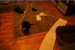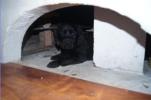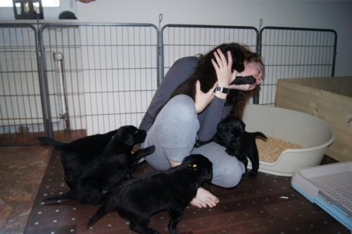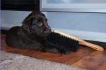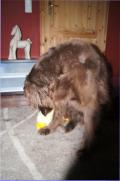 unsere “Supernanny” Amy, die uns eine große Hilfe ist16. Juli 2012Chaos ist unser Alltag..... Die Kleinen erobern die unterste Etage oder besser gesagt, haben diese eingenommen, beschlagnahmt oderbesetzt?! Im Welpenauslauf ist es schon lange zu eng und zu langweilig - trotz all der Mühe, die wir uns mit selbst erdachtem Spiel-zeug gegeben haben. Übrigens ist die Bälleinsel am Freitagabend den kleinen Zähnen doch noch zum Opfer gefallen... Auch das Beseitigen der nächtlichen Spuren nimmt morgens einiges an Zeit in Anspruch - ganz abgesehen von dem Duft..... Selbst die beachtliche Zahl an Duftlampen, Duftsprühern, etc. ist hier machtlos. Außer bei den zukünftigen Familien verzichten wir zur Zeit auf Besucher.... Ich bete, dass das Wetter besser wird, so dass ich auch mal richtig lüften kann, aber es regnet und regnet und regnet. Heute gab es den ersten Rinderknochen, der erst einmal neugierig von allen beäugt und dann mit großem Genuss angeknabbert wurde.Staubfänger unterm Kachelofen Miss Orange beim Besentest.... kurz nicht aufgepasst...das Ende der Bälleinsel