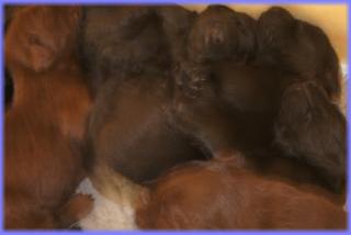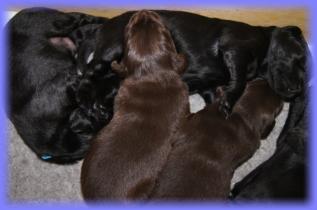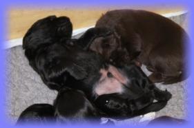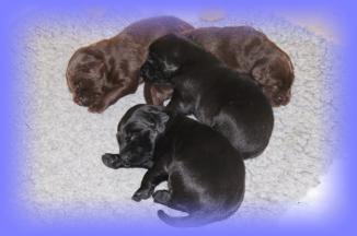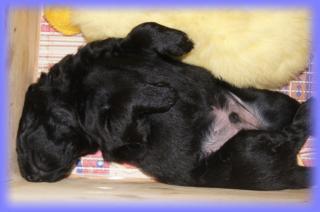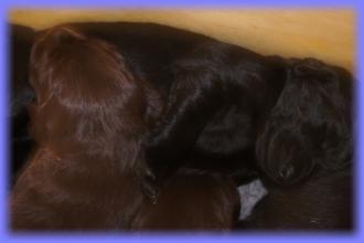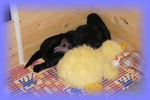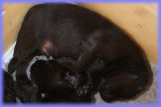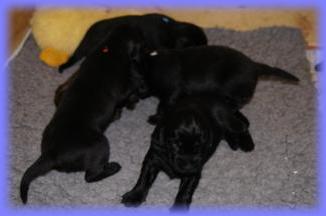 25.05.2013Nun beginnt schon die 3. Woche, mein Gott, wie die Zeit vergeht. Die Äuglein sind nun bei allen offen und der Putzigfaktornimmt noch einmal enorm zu :). Man schmilzt förmlich dahin, wenn man in die dunklen, kleinen Knopfaugen blickt. Solangsam entwickeln sie sich äußerlich von den kleinen “Happy Hippos” zu kleinen Hunden....26.05.2013Super, genau zum gleichen Zeitpunkt wie letztes Jahr bekommen 2 der Welpis Durchfall :( - vielleicht stellt sich bei Lilly zudiesem Zeit immer die Milch um, wer weiß. Aber in diesem Jahr bin ich vorbereitet und voll ausgerüstet, aber vor allem istmeine Freundin, die Tierärztin, nicht in Urlaub - läuft also alles bestens. Alle sind putzmunter und beginnen, naja auf ziemlichwacklige Weise, miteinander zu rangeln, zu knurren und zu bellen - erinnert ein wenig an die alten Godzillafilme :).28.05.2013Und hier ein paar Eindrücke von heute morgen: immer noch ein einziges Knäuel, aber viel größer als noch vor 1 oder gar 2Wochen :)C-Wurf * 11. Mai 2013Mr. BlueMr. White beim ChillenLucy & Franklin beim Kuschelnkleines RangelspielWho is who?Mr white beim Chillen mit Ente am 31.05.2013