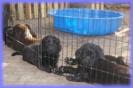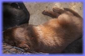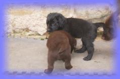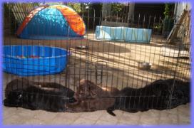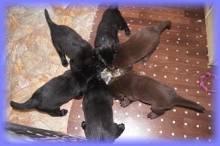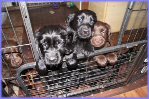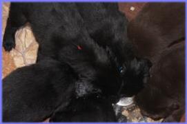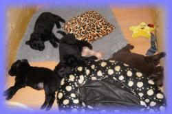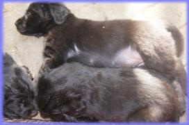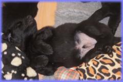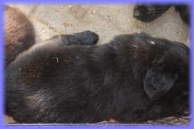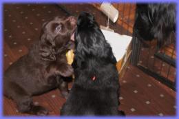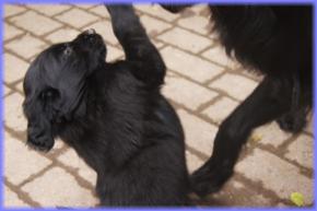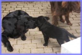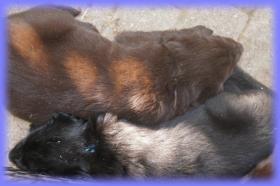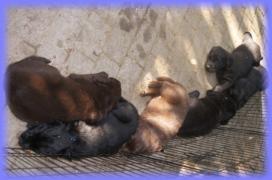 C-Wurf * 11. Mai 2013JungsRüde schwarz (blau) 3440gFranklin, Rüde braun (orange) 3210gCooper, Rüde braun lila) 3220gNilson, Rüde schwarz (rot) 3530gRüde schwarz (weiß) 3880gMädelsLucy, Hündin schwarz (gelb) 3570gVorab - es gibt auch neue Bilder bei Woche 5 :)Nun beginnt die 6. Woche und unsere Babies bzw. Halbstarken haben ihr Gewicht verzehnfacht!!!!!!! Ganz zu schweigen von derMobilität :) - alles ist interessant, wird untersucht und bekämpft. Staubsauger, Wischmopp, Fernseher, Flugzeuge und dasDurchqueren des Spieltunnels sind mittlerweile leichte Übungen für die Kleinen. Bald werden sie unseren gesamten Gartenerobern und zum ersten Mal mit dem Auto zur Koppel fahren, um die große weite Welt erkunden. Ein wunderbarer Wurf, der mich mit Stolz erfüllt. Meine C-Würfchen sind wahre Wunderbabies, kleine Streber (aber im nettenSinne). Nicht ein einziges Pippi muss ich morgens aus dem Auslauf wegwischen, alle, aber auch wirklich alle gehen nachts bravauf die vorbereiteten Pippiunterlagen :), spielen und beschäftigen sich ganz leise und wenn mal nur einer wach ist, spielt er ganzalleine, ganz ohne Gezeter. Wenn die so weitermachen, brauchen sie nicht mal in die Hundeschule :).... (war ein Scherz!!!)Mittlerweile hat das Becken vom Bällebad den Geist aufgegeben bzw. wurde erfolgreichzerstört .... eine Alternative muss nun her, damit die Kleinen weiterhin beschäftigt sind.sie schlafen schon wie die Großen :)... und trinken auch schon Wasser (Cooper)Zwischenmahlzeit bei Mama, immer noch megalecker...und gemeinsames Mittagessen, naja gebe zu,sieht eher wie ne Essenschlacht aus.....Kräftemessen zwischen Cooper und Nilsonhinter Gittern - wir wollen hier raus u. die Welt erkunden....... vielleicht mögen sie auch einfach nur die Gitter :) ?!... denn der Auslauf ist nicht wirklich klein ...die Dreckspatzen aus der VogelperspektiveFranklinNilson (oben) mit Lucy (u. links die Nase v. Mr White)...und hier der Rest von Mr WhiteCooper und Mr Blue.... na dann wollen wir nicht so sein und vergrößern einfach den Außauslauf :)20. Juni 2013Es ist soweit, unter Aufsicht erobern die kleinen Flatnasen bei schönem Wetter den gesamten Garten - ein riesen Spaß für die Vierbeiner, eine riesen Aufgabe für die Zweibeiner :) .....Mr Blue - stolz, denn er hat einen der Lieblingsplätze ergattert :)Mr White - souverän guckt er in die Kamera Cooper - immer viel zu schnell aus dem Bild :) - es gibt viel zu tunNilson - zwar hinterGittern, aber nicht eingesperrt - sie liebendie Gitter einfach ......... aber auch die einzigeMöglichkeit ihn zu foto-grafieren, da sofortzu mir kommt o.hinter mir herläuft ....Lucy unsere kleine KampfhummelFranklin - ebenfalls hinter Gittern, aber aus einer anderen PerspektiveBalou liebt die Kleinen total - hier mit Mr White