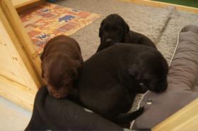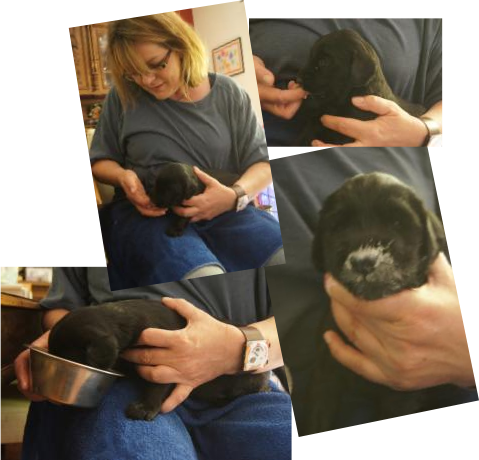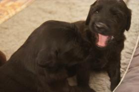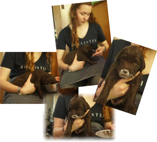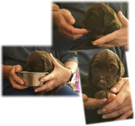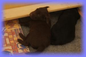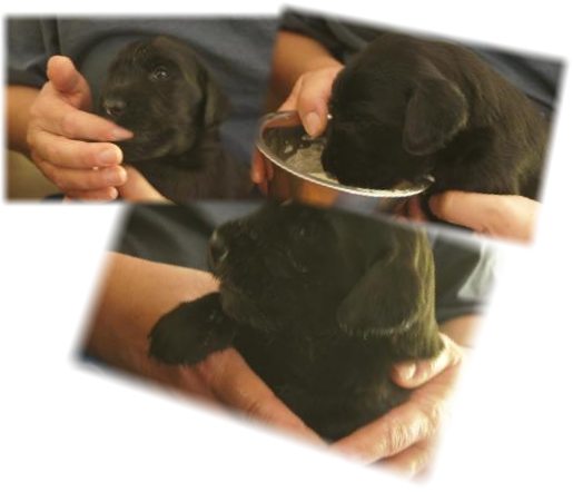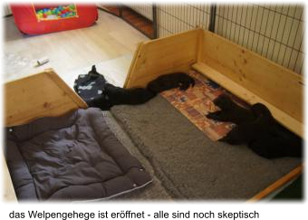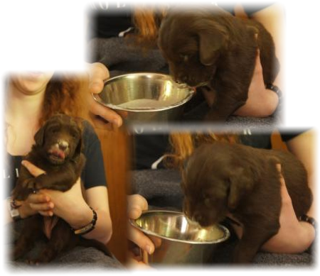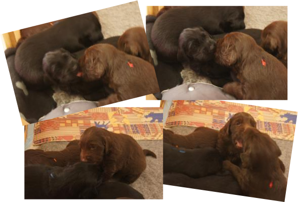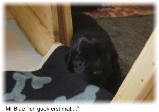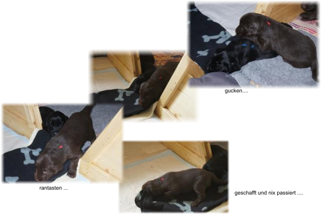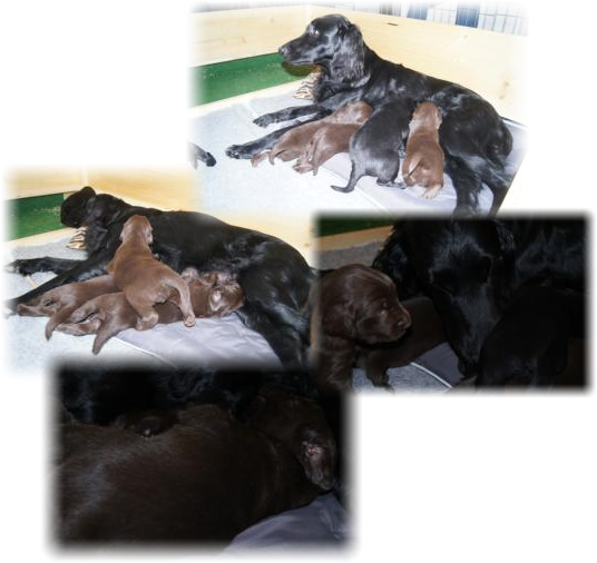 D-Wurf * 25. April 20154. WocheDie Müuse haben gut zugelegt und bringen Leben in die Welpenkiste - es wird gebellt, geknurrt und gekämpft. Nun reagieren sie auch auf Geräusche und fühlen sich so manches Mal von mir gestört, wenn ich staubsauge oder einer unserer Flattis gegen das Welpengitterwedelt. Wenn Lilly im Welpengehege gefüttert wird (5x am Tag) werden sie sofort wach und beginnen zu schimpfen was das Zeug hält ....Heute gibts die erste Wurmkur und ich hoffe, wir können ein paar Fotos machen, die Mimik ist unbeschreiblich ob des anscheinend widerlichen Geschmackes. Dieses Mal wird es wohl noch recht einfach für uns, aber von Mal zu Mal werden die Kleinen sich mehrund mehr wehren . Was ist da los? Oh, die Welt hat gar keine Holzwände....?näher gucken ...Kuscheln bei Mama- dann ist die Welt in Ordnung18. Mai 2015Heute gibt es zum 1. Mal Milch, die nicht von Mama kommt. Die Kleinen müssen nun lernen ihre Milch aus einem Napf zu fressen. Normalerweise nicht ganz so einfach und erfahrungsgemäß sind nicht nur die Flatnäschen hinterher voller Milch sondern auch wir, unsere Kleider und das Umfeld, aber unsere D-chen sind Superbabys, die ausnahmslos alle sofort begriffen haben, dass man vom Essen so wenig wie möglich daneben kleckert und die Milch auch nicht zum Tauchen da ist.... Mr Orange1. am Finger probieren - schmeckt2. dann aus vollen Zügen genießen3. fertig - das war lecker ....Miss VioletMr BlueMiss ClearblueMr Red.... und alle schmecken jetzt sooo lecker - auch der kleinste Tropfen der kostbaren Milch wird abgeschleckt